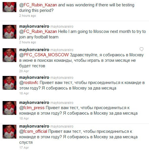 Житель Кампу-Гранди Майкон Варейро через твиттер предпринимает попытки найти себе клуб в России. Бразилец в мае намеревается посетить Москву и за два месяца найти себе команду.