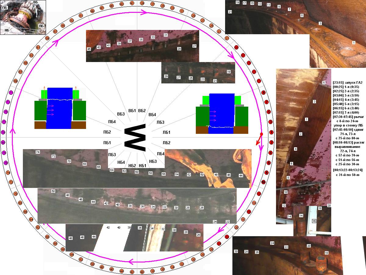 Вот одна подсказка (фото) и схема "полома" шпилек-чередование секторами обломов шпилек "пеньком", "срез"под корень и целые. (кто-то потрудился) По данной схеме можно только нагородить кучу домыслов...Объясняю почему: Как показывает практика, для конструирования резьбовых соединений при помощи шпилек просто необходим точный и методичный подход. В этом деле нельзя сделать ни одного неверного шага, потому что любая ошибка, даже самая маленькая, может привести к большим финансовым потерям и просто катастрофическим последствиям. Как показывают некоторые исследования, повреждения в резьбовых соединениях (при использовании шпильки резьбовой) возникают из – за нескольких неприятных факторов: неправильно подобранные компоненты соединения, недостаточное или слишком превышенное усилие затяжки, неравномерное распределение усилия затяжки соединительных резьбовых компонентов (шпилек). В связи с вышеперечисленными факторами особо важными становятся вопросы правильного выбора компонентов резьбовых соединений (шпильки, болты) и инструмента, который используется для затяжки резьбовых соединительных компонентов. Именно эти два фактора нуждаются в особом внимании и профессиональном подходе к работе с соединительными резьбовыми деталями. поскольку нет конкретных данных о состоянии соединений и выполнения необходимых требований, то эта схема ни о чем не говорит...Можно придумывать , что угодно..начиная с того момента, когда первое воздействие послужило началом разрушения первых элементов ...а дальше уже чисто цепная реакция от воздействия давления и кинетической энергии вращения огромной массы... -------------------- |