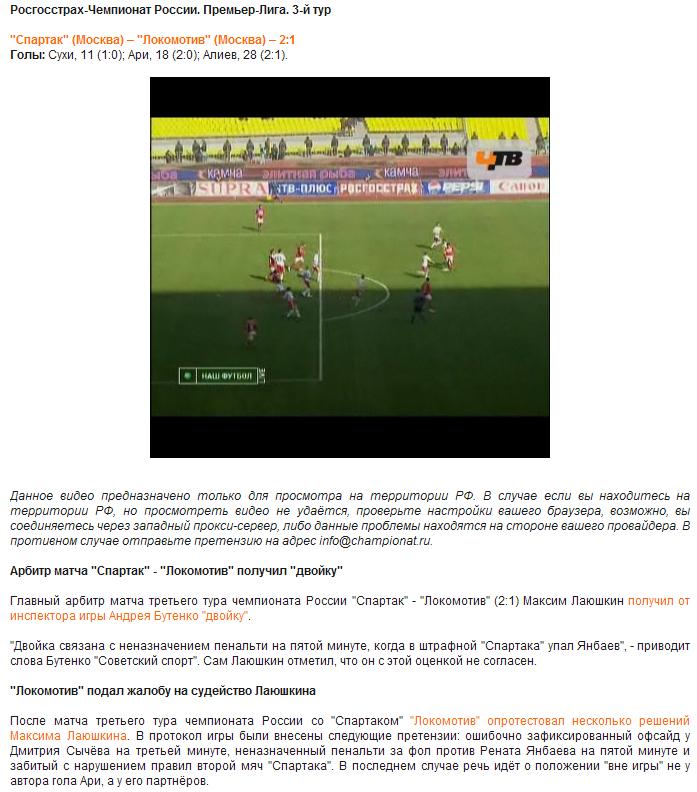 "Локомотив" требует наказать арбитра Максима Лаюшкина Представители столичного "Локомотива" опротестовали несколько решений арбитра Максима Лаюшкина в матче третьего тура чемпионата России по футболу с московским "Локомотивом" (2:1), сообщает Bobsoccer.ru. Они уверены, что именно грубые ошибки рефери в самом начале игры не позволили "Локомотиву" добиться успеха. Если бы не спорные решения арбитра, то уже к 5-й минуте матча "Локо" мог вести в счете с разницей в два мяча. Но в дебюте встречи Лаюшкин в паре с боковым арбитром сначала зафиксировал ошибочный офсайд у Дмитрия Сычева, который выходил один на один с голкипером "Спартака". А затем не зафиксировал явный фол Паршивлюка в пределах спартаковской штрафной против Рената Янбаева. Кроме того, железнодорожники подали протест еще по одному эпизоду. Второй гол, по мнению Семина, красно-белые забили с нарушением правил, поскольку во время последнего паса один из спартаковцев находился в положении "вне игры". Лаюшкин получил двойку за неназначенный пенальти. Ну а со вторым голом, вот скриншот момента, комментарии наверное излишни, обратите внимание на позицию бокового арбитра: Сообщение было отредактировано ГЕРА-Horse: 30.03.2010, 10:04 Эскизы прикрепленных изображений -------------------- |