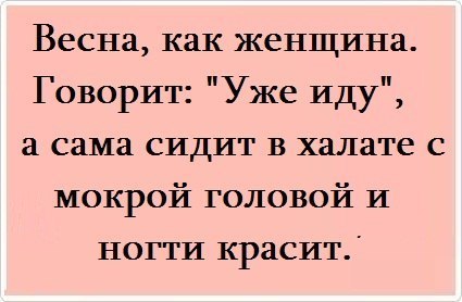 этточно!)) обе они, и женщина и весна, в отношении опозданий.. достойные друг друга "подружки" -------------------- Нет недостижимых целей – есть высокий коэффициент лени, недостаток смекалки и запас отговорок