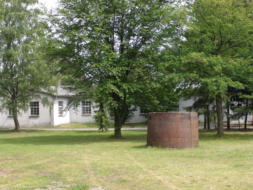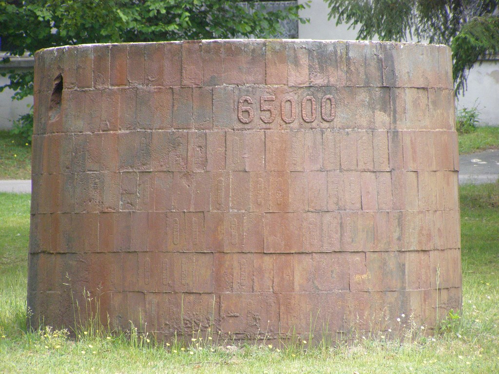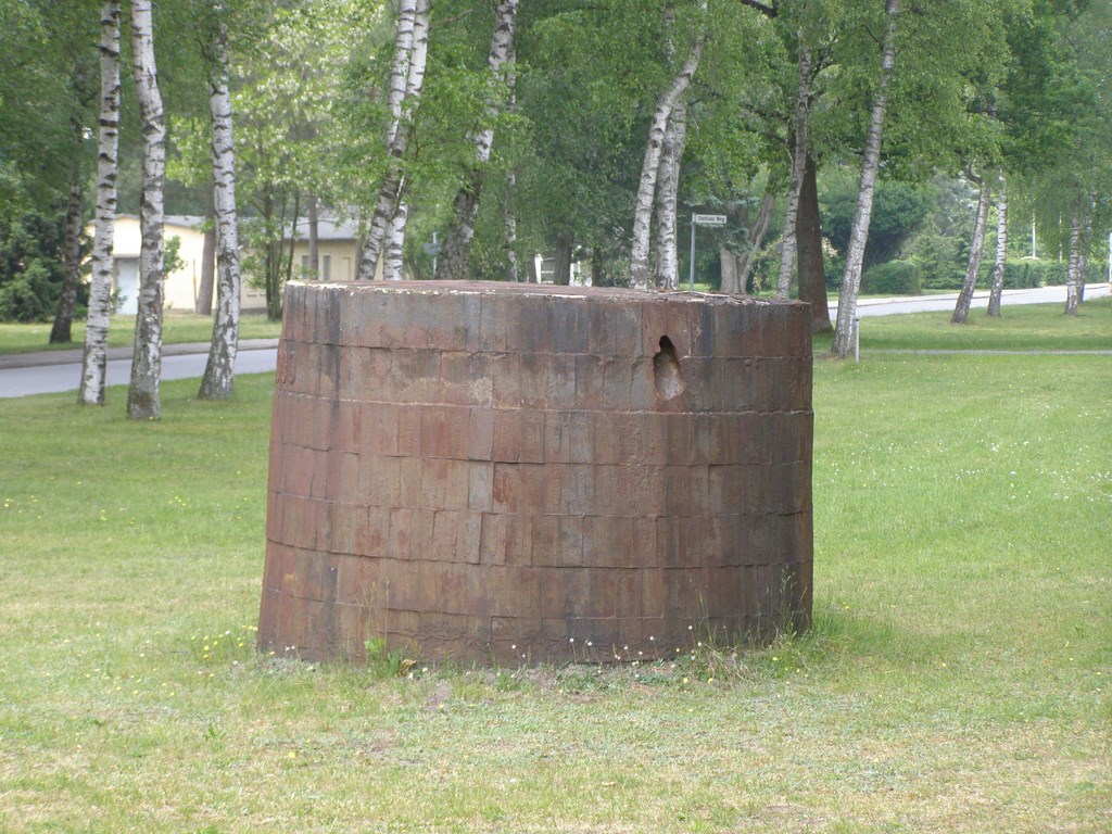 Литой из чугуна цилиндр стоит западнее "бани". Вес его составляет 65000 кг (по числу жертв). Памятник установлен без фундамента на грунт. Рядом яма-водоём для пожарных нужд. История такова: архитектор, придумавший этот символический памятник, заявил - "Память об этом месте исчезнет, как только этот цилиндр скроется под землёй под собственным весом". Действительно, по замерам ежегодная усадка составляет около сантиметра и потребуется для этого 300-350 лет. -------------------- Однажды ученик спросил у Мастера: