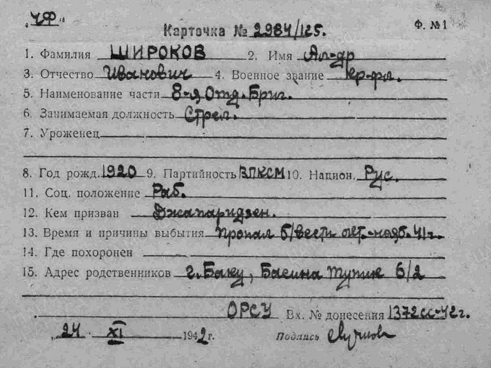 Здравствуйте, у нас практически такая же история, за исключением ,что нашелся !!!! Дедушка Широков Александр Иванович 1925г.р , краснофлотец.воевал в ЧФ 8 бригада морской пехоты, пропал без вести !!!!!!!!Всю жизнь бабушка , его сестра искала , не верила до конца , что он мертв!!! Может есть какие-то еще данные , захоронения (((((((((( , ищем ищем ...толку нет !!!!